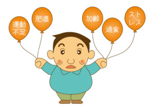 糖尿病への初めの段階として、過食による肥満、栄養バランスの乱れ、運動不足、加齢などによって血液中の糖分、コレステロール、中性脂肪の濃度が上昇します。
